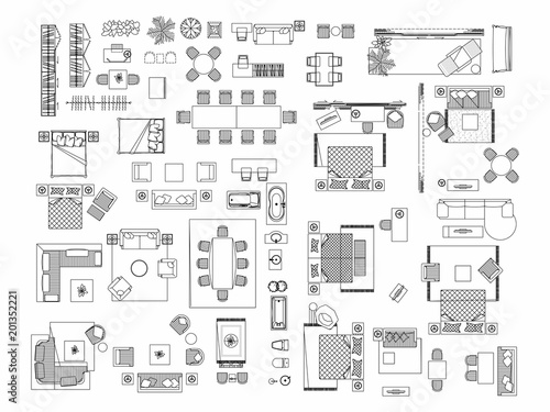 Top View Interior With Line Furniture Icons Vector Set Stock