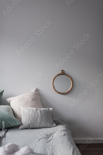 Bett Mit Vielen Kissen Aus Samt Und Leinen Und Einem Spiegel
